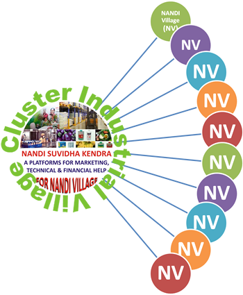 NANDI SUVIDHA KENDRAThe most attracting feature of Entrepreneurship is development of NANDI Suvidha Kendra which will be the common platform to support the social enterprises at financial and Technical level. It will also function as facilitation centre to develop partnership, to provide marketing platform, to conduct training, to organize fair and exhibition etc. There will be one NANDI Suvidha Kendra among ten villages or community having population of 25000. NANDI Suvidha Kendra will also function as business hub external traders will be associated. Every Suvidha Kendra will be developed with the help of private financers or by collective support of enterprises associated with alliance. Every Suvidha Kendra will have Agro Clinic, Marketing and Technical Support Centre. | ![]() |